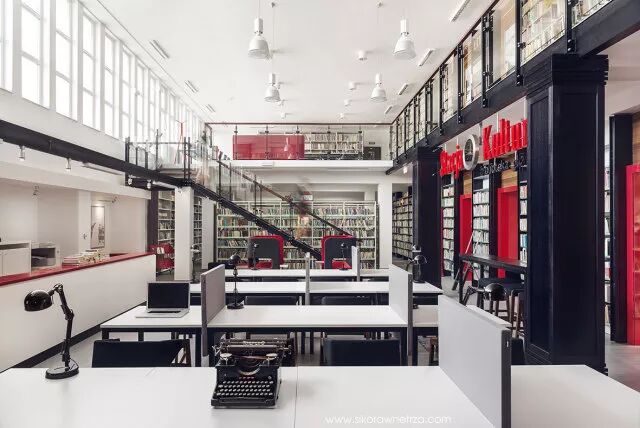 华沙大学新图书馆的设计主题是“树林中的城市”,整体建筑素雅,环境优美,墙上爬满植物。植物覆盖面积超过5000平方米,分为屋顶花园和后花园两部分。其中屋顶花园面积2000平方米,植物生长在30厘米厚的土壤上,根据植物的外形、颜色、芳香气味和生长环境,分成金、银、紫、绿四个植物园区,是欧洲最大和最漂亮的屋顶花园之一。人们站在屋顶,可将华沙全景尽收眼底。 后花园更大,达1.5万平方米,几座老房子和系列雕塑与庭院有机结合在一起,还有鸭子等动物。它以草坪为主,种植了大量的灌木类花草、攀缘植物和不多的乔木。后花园用喷泉和藤架加以点缀,两条小路和一条溪水蜿蜒穿行其间,显得格外美丽幽静。建筑师别具匠心,通过潺潺流水的小溪和阶梯式的小瀑布将屋顶花园和后花园连为一体。华沙大学图书馆花园现在已经成为一个美丽的城市公园,是华沙大学师生和华沙市民休闲的好地方。 华沙大学图书馆在服务于5000名大学教职员工和5.9万名大学生的同时也对普通市民开放,他们可以像在校师生一样使用图书馆。 建在火车站里 在波兰北部,鲁米亚火车站一座破旧的大楼经过改造升级后,作为“波兰文化火车站”重新开放。其中图书馆约占车站总面积的80%,整个工程造价500万兹罗提。建筑师将火车站和火车头的风格融入图书馆黑红相间的细节设计中,书架的模样看起来像铁路轨道。它融合了火车站、公共图书馆和文化中心的功能,是鲁米亚图书馆的主要办公场所,成为当地居民的活动中心,也为到这个波兰海边城市度假的游客服务。